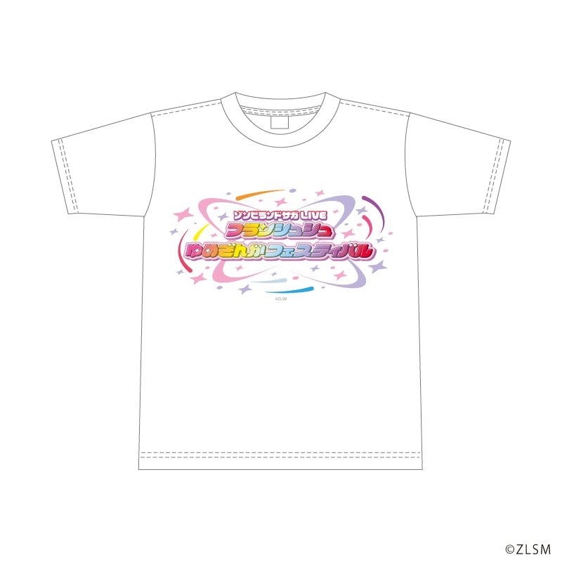 「ゾンビランドサガLIVE~フランシュシュ ゆめぎんがフェスティバル~」の描き下ろしイラストが着用しているTシャツとお揃いのTシャツです。ブラックは描き下ろしイラストを使用したデザインとなっています。