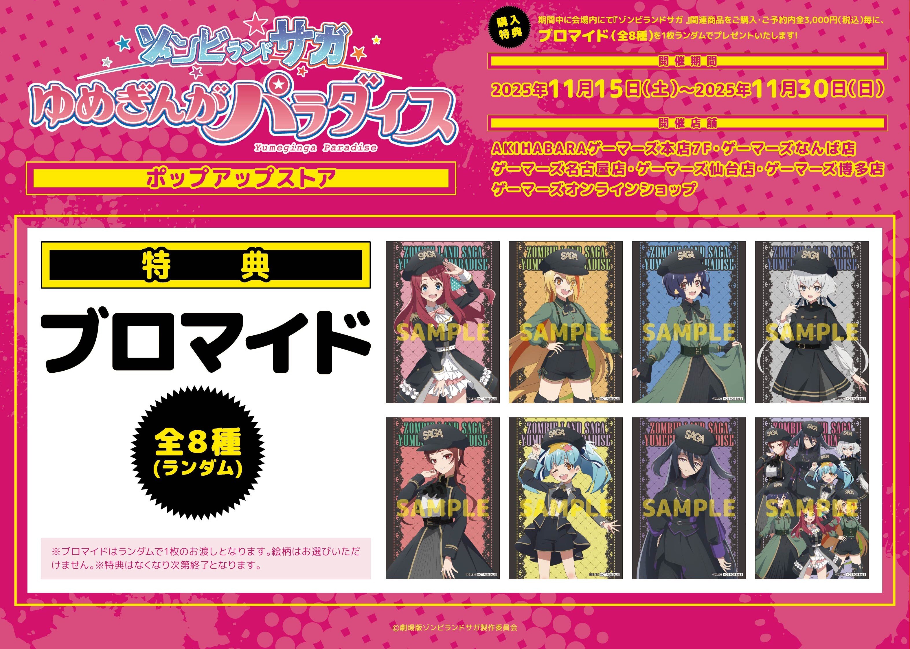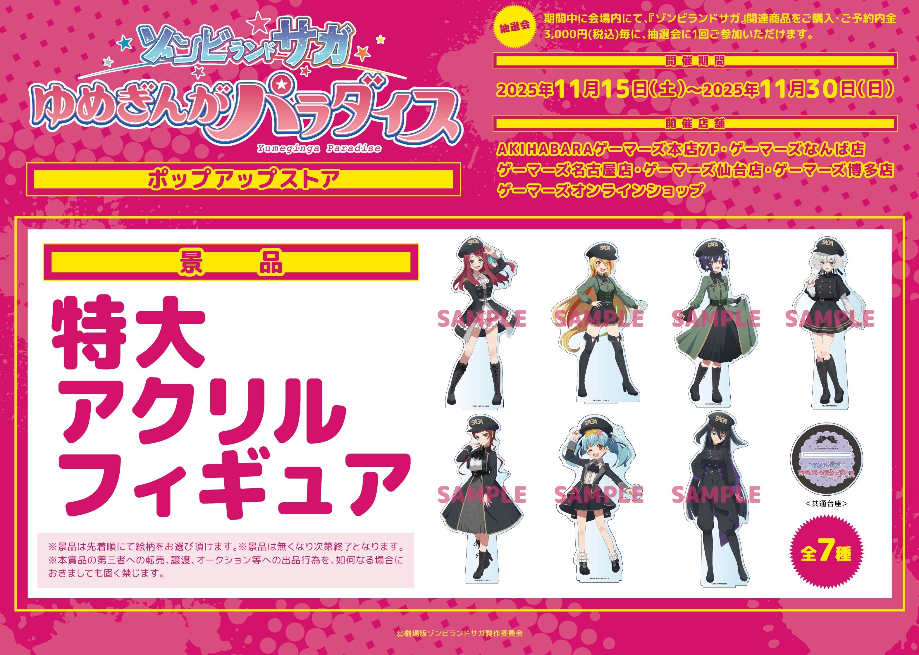 劇場版『ゾンビランドサガ ゆめぎんがパラダイス』ポップアップストアを開催いたします。新規描き下ろしイラストを使用した新作グッズの販売や、抽選会などをご用意しております!!