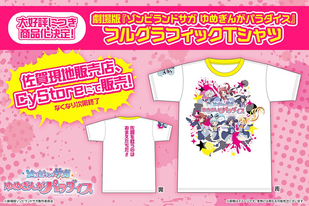 佐賀県内一部の自治体職員の方々に着用いただいている劇場版『ゾンビランドサガ ゆめぎんがパラダイス』フルグラフィックTシャツが、ゾンビィの皆さんの熱いご要望にお応えし遂に商品化決定!
